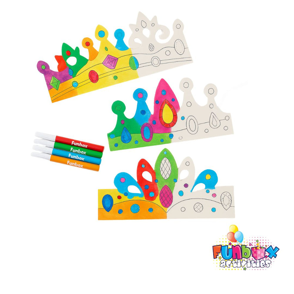 Each pack includes 6 crowns featuring 3 different designs, ready to be coloured, styled, and sparkled up! Made from sturdy white cardstock, these crowns can be decorated with markers, paint, glitter, or glue — anything your imagination desires.
