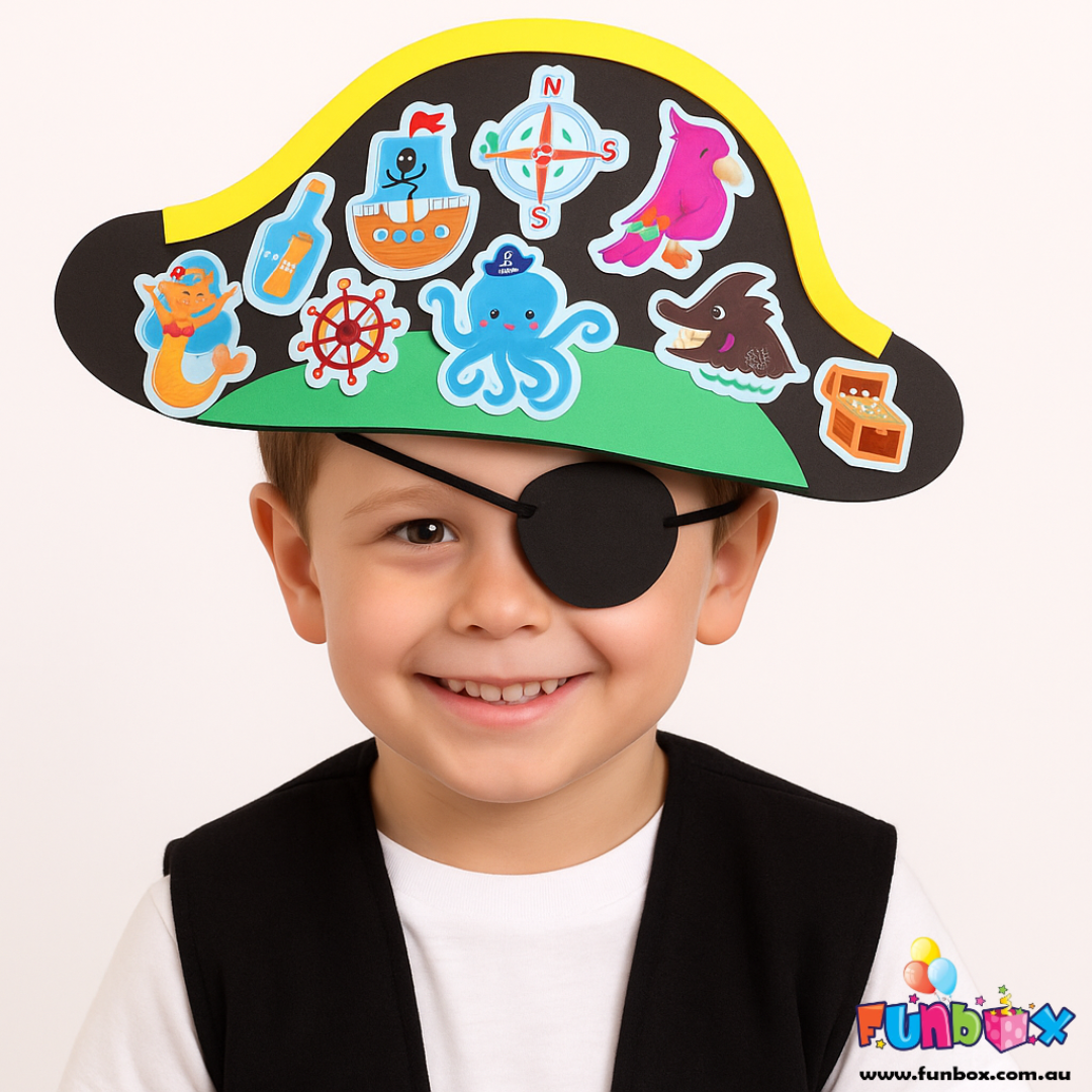 Plunder and explore the high seas in style with this easy-to-make kit that includes stickers for decorating. You'll have a stylish pirate hat and eye patch in no time, to wear on your next treasure hunt!